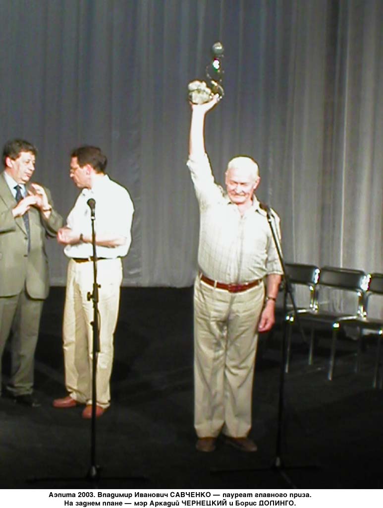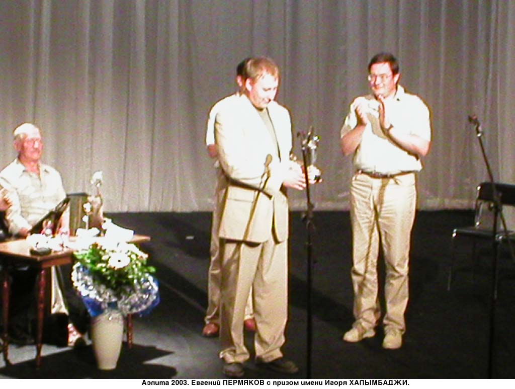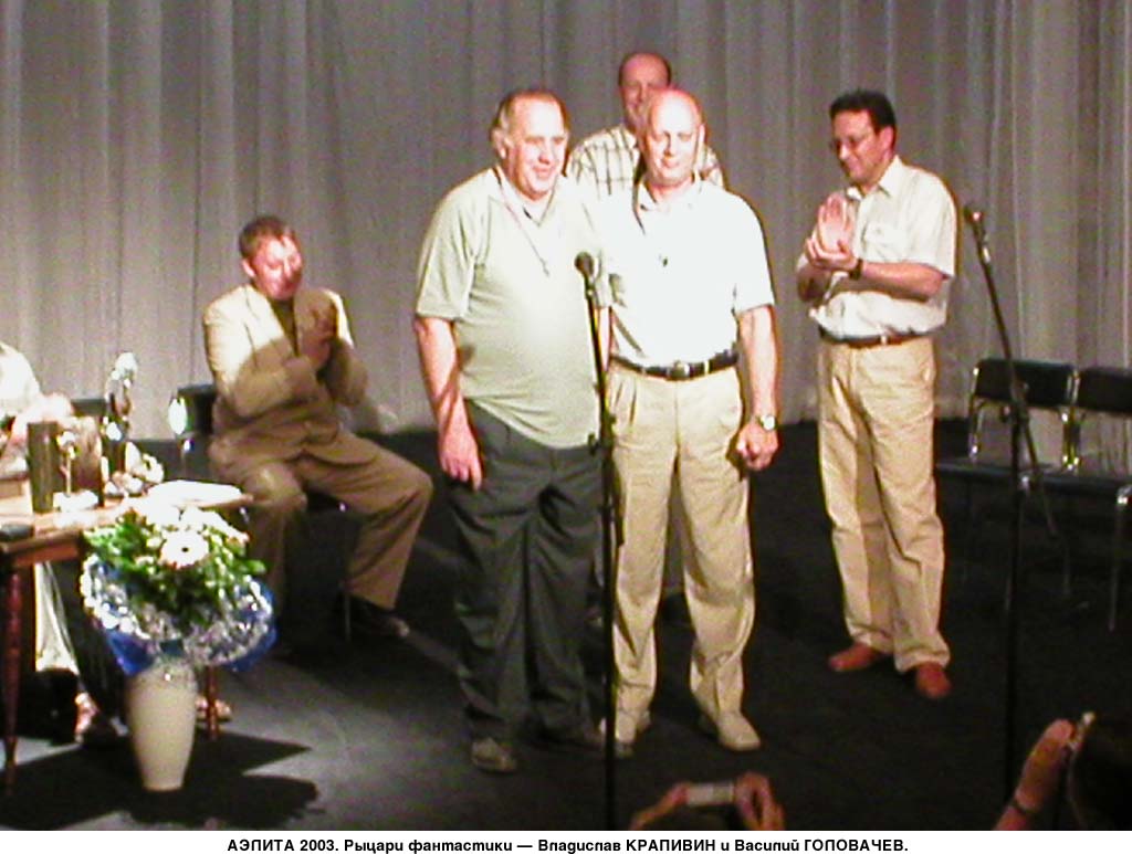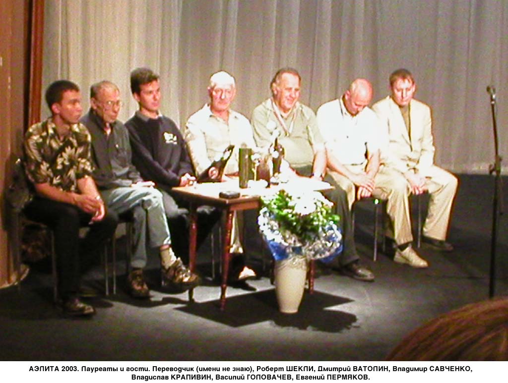 учил хорошо!" Кстати, о столичной самодостаточности, которой Екатеринбург еще только прихварывает (а та же Москва больна и неизлечима -- там давно уже всерьез полагают, что нефть качают в районе Выхина, а хлеб жнут на житницах Бирюлева). Ну да, писатель Ира Коблова не помнит и, разумеется, не читает писателя Филенко. Борис Долинго, милейший в общении человек, о существовании писателя Филенко так и вовсе не знает. "Обыдно, клянусь, чесс-слово!.." (тов. Саахов, кажется). Ну так поделом вору и мука. И я ведь тоже ничего не читаю из того, что пишут все эти юные дарования из АСТа, и никто меня не заставит это читать и тем более покупать (уж как хотите, а я давно не люблю фантастику, книг не покупаю, а принимаю исключительно в дар с посвящением, и тогда возникает некоторый шанс, что таки прочту... так было с Леной Долговой -- подарила мне "вечевскую" книжку, а уж "Центуриона" я сам покупал), и фамилий их не знаю, да и сейчас, по личной встрече, не запомнил, и тот же Борис Долинго, говорят, что-то пишет, а я про него узнал, лишь когда заявлялся на участие в "Аэлите". "Много нас, много..." (М. М. Жванецкий). Так, что еще? А, собственно вручение. Оно имело место в прелестном маленьком зале Камерного театра. Зал был полон, слава богу -- фэны загодя забили мне место. Юлий Буркин мотался по залу, делая вид, что он фотокорреспондент -- его фотоснимки будут явно лучше моих. В сторонке скромно сидел очень немолодой уже замечательный уральский фантаст Сергей Другаль. Действо было заформализовано еще страшнее всего остального. Слово через раз давали спонсорам, которые чувствовали себя не в своей тарелке настолько, что даже забывали хвалить свою продукцию. Выступил мэр города Аркадий Чернецкий, о котором мне шепнули, что, мол, не любят его здесь. Ну, не знаю. Город в порядке, полно банков и всяких там театров, которые отнюдь не похожи на загнивающие пережитки прошлого. И не упомню что-то, чтобы наш пермский мэр хотя бы вспомнил о том, что во вверенном ему городе полно фантастов самой первой руки. Наш-то, похоже, и не подозревает, что вообще есть какие-то писатели... ну, да хватит о грустном. Итак: "Аэлиту" вручили Владимиру Ивановичу Савченко, судя по всему -- "гонорис кауза". Ну, это хороший выбор. Приз имени Игоря Халымбаджи дали Евгению Пермякову -- за то, что здесь вообще хоть что-то нынче вручалось и происходило. Крапивин и Головачев стали кавалерами ордена "Рыцарь фантастики". Люди они совершенно разные... но "Аэлита" всегда славилась стремлением охватить и объединить. Вспомним, что приз № 1 был вручен братьям Стругацким и Казанцеву, а это все равно, что... нет, прочь аллюзии! Василий Васильевич не преминул удачно сострить: "А ведь это канонизация!" И за сценой грянула "Аллилуйя"... Под конец в воздухе