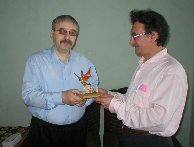 ![]() Андрей Ермолаев еще раз, на бис, вручает Евгению Филенко его "Большой Зилант 2003". Первый раз это делал Слава Логинов на сцене, но так тоже приятно. |