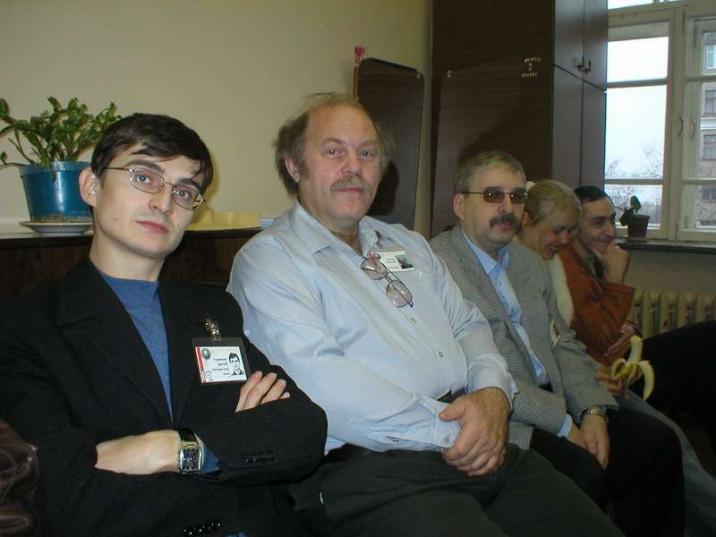 ![]() Пресс-конференция писателей: С. Логинов, Е. Филенко, Л. Каганов между и рядом с письменником А. Зоричем. |